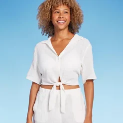 Women’s Button-Up Tie-Front Cover Up Top – Shade & Shoreâ„¢ Off-White