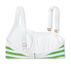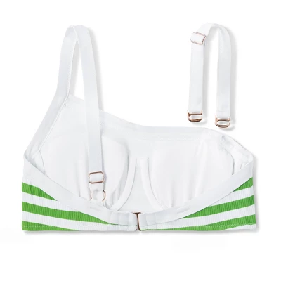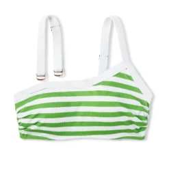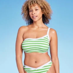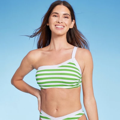 Flaunt your cool style as you take a dip in the pool or soak up the sun with this Underwire Ribbed One-Shoulder Bikini Top from Shade & Shore . Fashioned in a green and white stripe pattern with a one-shoulder neckline, this ribbed bikini top lends a perfect finishing touch to your swim looks. Crafted from a soft and stretchy fabric blend with a hint of spandex, this one-shoulder bikini top features a back hook-and-loop closure for a comfy, secure fit, while the removable padding with underwire offers light lift and structure. Slip on the matching bikini bottom for cohesive style or mix things up with your favorite printed swim bottom.