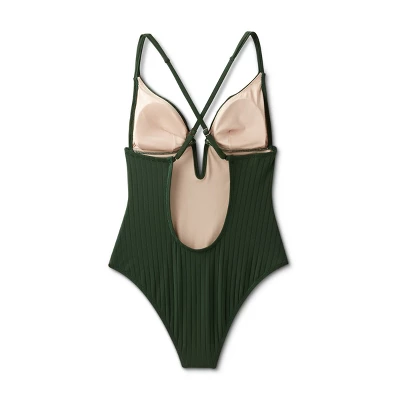 You are sure to steal all the stares when you wear the Ribbed Plunge Front V-Wire One-Piece Swimsuit from Shade & Shoreâ„¢ to the beach. Made from a soft and stretchy fabric, this swimsuit for women is adorned with allover ribbing in a solid hue for a fun textural look. The pull-on swimsuit is fashioned with a plunging sweetheart neckline accented with a V-wire front design to add peek-a-boo flair. The pull-on swimsuit has slender, adjustable shoulder straps that create a crisscross pattern at the back and help you customize the fit for confident wear in and out of the water. Complete your look with a beach cover-up, oversized sunnies and espadrille sandals.