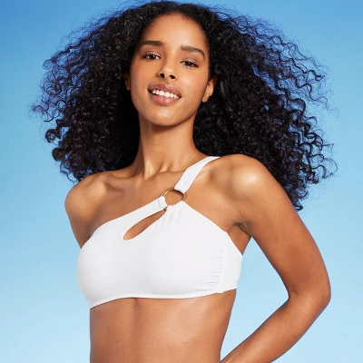 Bring a fashion-forward look to your swimwear collection with this Ring One-Shoulder Bikini Top from Shade & Shoreâ„¢. Made from stretchy fabric for flexible comfort, this one-shoulder bikini top in a fresh white color showcases a front cutout design with a metal ring accent for a chic touch of shine. The adjustable shoulder strap and a back hook closure ensure a worry-free fit, while the removable padded cups offer customizable coverage and confident wear. Pair with a matching bikini bottom or other swim bottoms for versatile swimwear options.