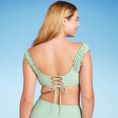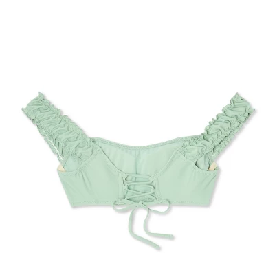 Add a pop of playful panache to your waterside ensembles with this Shirred Off-the-Shoulder Bralette Lace-Up Bikini Top from Shade & Shoreâ„¢. In a light-green finish, this swim top has off-the-shoulder straps with shirring to add textural appeal to your summer sass. Lace-style crisscross ties at the back complete the design with a customizable fit for confident wear in and out of the water. Pair with a matching bikini bottom and your fave flip-flops for a cute, beach-ready ensemble.