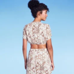 Stay in style while flaunting your standout look by wearing the Tie-Front Short-Sleeve Cover-Up Crop Top from Shade & Shoreâ„¢. This short-sleeve cover-up top features snake print in tan and cream hues for an elegant look. The deep V-neckline with tie front elevates the look, while the 100% rayon fabric provides all-day comfort. Simply pair it with the snake-print bottom to complete the look.